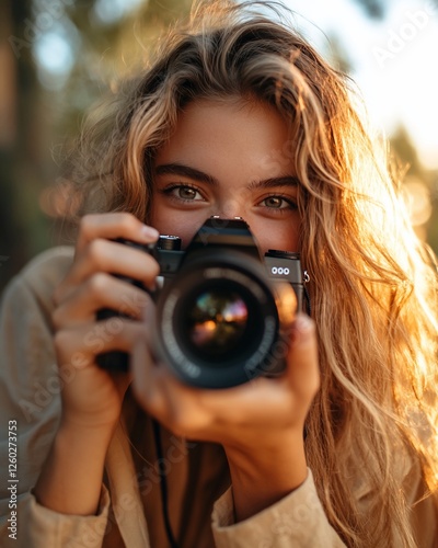 Woman photographer, golden hour, nature, camera, outdoor shoot