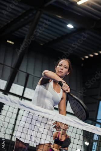 Woman playing padel tennis indoors, focused on hitting ball with racket