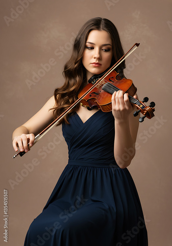 Woman playing the violin in elegant dress against a neutral background