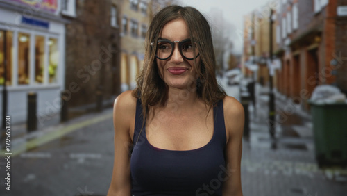 woman, finger, pointing, street, female, city, outdoors, goggles, tank top, young, playful, curiosity, grin, shoulder, chest, smile, gesture, hand, expressive, candid, urban, pavement, bollard, ashbin, brunette, piercing, sleeveless, casual clothes, smiling, face, expression, sidewalk, young adult, round, point, standing, interaction, daylight, casual attire, smirk, attitude, urban life, metropolis, bold, approachable, summer, downtown