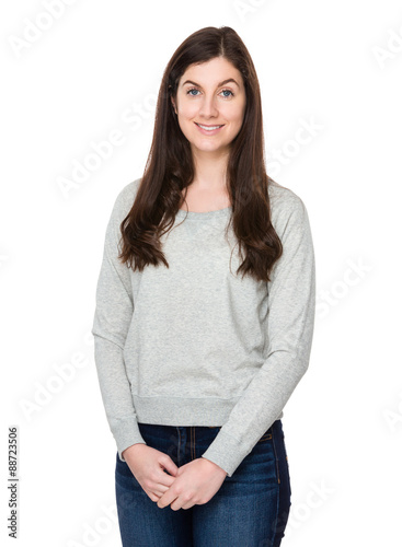 woman, lady, girl, female, casual attire, wear, tee, long, sleeve, adult, simple, blank, design, logotype, confident, smart, successful, smile, happy, friendly, positive, content, satisfied, proud, dependability, modern, clever, succeed, isolated, white, background, people, person, portrait, 1, young, mature, grey, beautiful, pretty, caucasian, european, brunette, brunet, latin