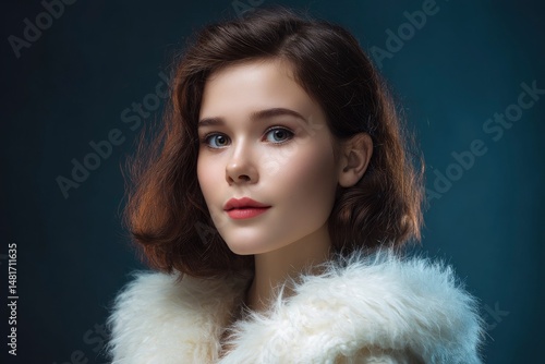 Woman Portrait with Furry White Coat on Dark Background