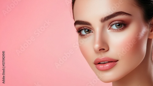 Woman Portrait with Professional Makeup Looking at Camera on Pink Background