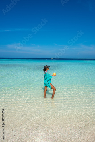 Woman posing and holding coconut. Tropical island beach landscape exotic shore coast. Summer vacation, holiday amazing nature. Relax paradise, Maldives.