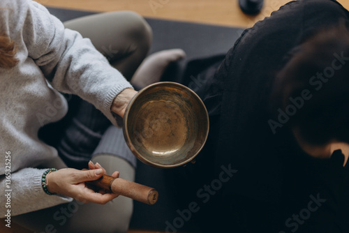 woman practicing yoga lesson with Tibetan Sound Bowl. Buddhism And Meditating Therapy