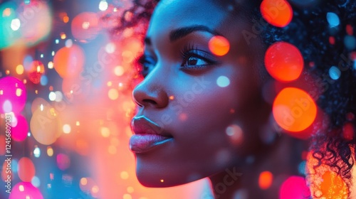 woman, girl, female, portrait, face, beauty, model, skin, hair, curly, afro, light, bokeh, colourful, vibrant, red, orange, pink, purple, blue, glow, sparkle, shine, night, city, dark, background, abstract, dreamy, pensive, hopeful, confident, elegant, fashion, style, expression, emotion, mood, attitude, sharpened, closeup, side, profile, person, human, young, adult