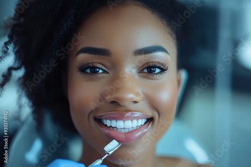 Woman Receiving Teeth Cleaning at Dentist's Office with Toothbrush in Hand