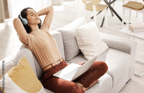 Woman, relax and remote work with headphones doing marketing research on a living room sofa. Black woman calm listening to music working on internet with technology in peace at home feeling zen