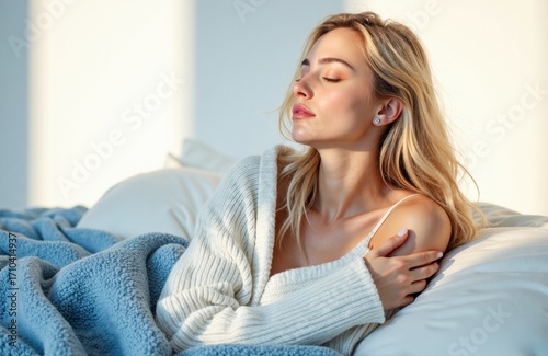 woman, female, relaxing, bed, cosy, peaceful, calm, comfort, sleep, rest, bedchamber, sunlight, soft, serene, leisure, calmness, comforter, blanket, morning, casual attire, lifestyle, wellness, relaxation, space, contentment, happiness, to rest, gentle, soothing, natural, light, indoor