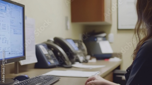 woman, office, desk, datum, computer, reviewing, working, phone, business, health care, employee, workplace, professional, technology, monitor, screen, keyboard, document, analysis, information, chart, graph, report, research, administration, management, medicals, secretary, assistant, receptionist, call center, office worker, businesswoman, team, collaboration, productivity, efficiency, success, career, job, employment, work, lifestyle, digital