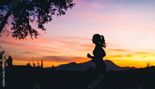 Woman Running at Sunset with Mountain Silhouette and Tree Branch