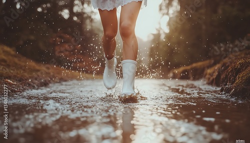 running, puddle, forest, woman, boot, water, rain, nature, happy, splash, joy, fun, outdoors, lifestyle, activity, childhood, leisure, playing, wet, leg, springtime, ground, sunlight, environment, happiness, adventure, carefree, motion, season, closeup