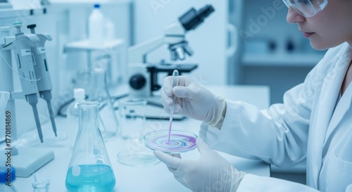 biopolymer, woman, scientist, research, laboratory, petri, dish, experiment, pipette, laboratory, science, medicals, health care, biotechnology, chemistry, deoxyribonucleic acid, biology, genetic, engineering, canvasses, analysis, study, chemical, microscope, equipment, clinic, hospital, development, discovery, health, care, innovation, future, medicine, technology, test, solution, liquid, fluid, gloved, hand, white, coat, researcher, pharmaceutical, pharmaceutical, academic, education