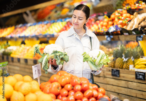 Woman shopping in grocery supermarket - choosing broccoli cabbage