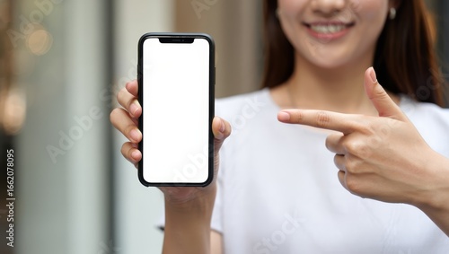 smartphone, screen, blank, display, mobile, phone, woman, hand, pointing, finger, technology, digital, device, contraption, app, application, interface, design, template, presentation, marketing, advertising, promotion, communication, connection, network, online, wireless, modern, innovation, future, trend, stylish, closeup, portrait, smiling, happy, girl, person
