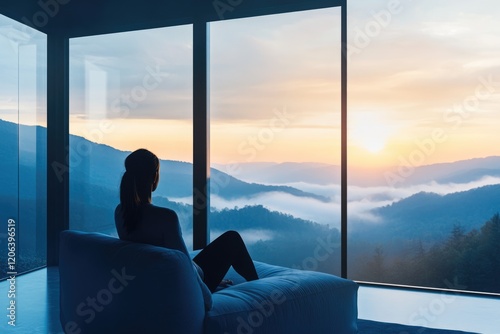 sunrise, sunset, mountain, fog, cloud, woman, silhouette, peaceful, serene, calm, calmness, relaxation, contemplation, view, landscape, scenery, nature, outdoors, window, minimalist, home, comfort, cosy, morning, evening, daybreak, twilight, solitude, meditation, yoga, mindfulness, breathtaking, beautiful, majestic, inspiring, travel, adventure, escape