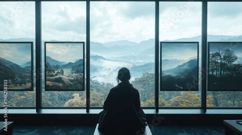 woman, seated, mountain, view, window, landscape, scenic, nature, scenery, sitting, person, girl, female, silhouette, back, looking, fog, mist, vale, hill, panorama, serene, tranquil, calm, peaceful, quiet, contemplation, meditation, relaxation, peace, solitude, journey, travel, escape, vista, horizon, sky, cloud, tree, green, blue, grey, ambient, atmospheric, perspective, distant