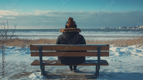 Woman sits alone on a snow-covered bench overlooking a frozen winter sea, wearing headphones. Perfect for themes of solitude, reflection, or winter landscapes.