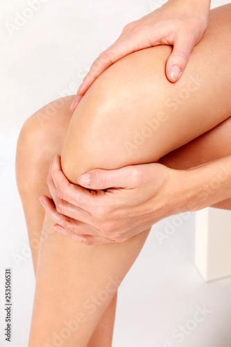 Woman sits on the white stool and touches leg by hands, skin care concept