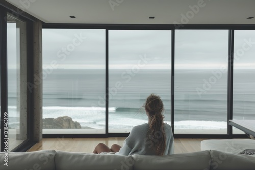 Woman Sitting on Couch Looking Out at Ocean View Through Large Windows