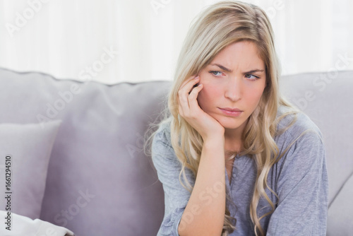 woman, sofa, home, pensive, introspective, comfort, serenity, relaxation, cushion, curtain, single, blond, long hair, casual attire, sitting, leaning, hand, support, gaze, thoughtful, concern, contemplation, pale, grey, light grey, indoor, living room, minimalism, interior, window, white, calm, quiet, solitude, reflective, peaceful, mellow, domestic, cosy, rest, seated, half face, copy space, softness, tranquil, still