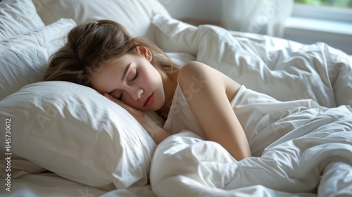 woman sleeping in a white bed with soft pillows and covers, relaxing at home or in a hotel, in the style of a peaceful sleep concept