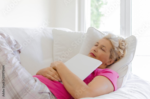 adult, bed, blond, book, casual attire, caucasian, closed eyes, closeup, comfortable, copy space, couch, cover, cosy, day, education, empty, enjoying, enjoyment, female, holding, home, house, indoor, lifestyle, literature, living room, lying, nap, note, old, older, 1, person, portrait, reading, relax, relaxation, relaxing, rest, resting, senior, sleeping, sleepy, sofa, studying, white, woman
