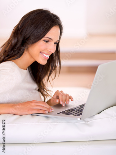 Woman, smile and laptop on couch at home, living room and apartment for remote work, virtual job and creative career. Female person, freelancer or writer for online publication, blog or email