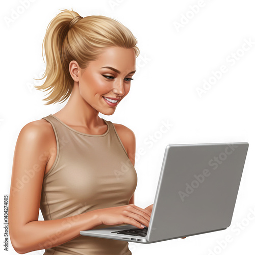 background, transparent, woman, laptop, smile, blond, computer, technology, digital, device, cyberspace, online, female, screen, typing, work, business, ponytail, content, happy, modern, design, office, portable, communication, connectivity, network, application, program, software, career, user