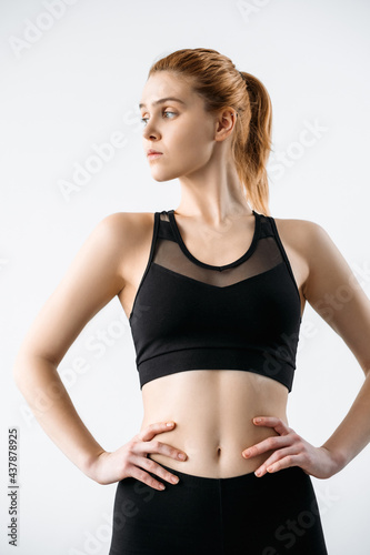 crop, top, clothing, active, lifestyle, fitness, outfit, front, view, female, athletic, model, slim, body, logotype, black, mesh, isolated, neutral, woman, activewear, branding, activewear, blank, bra, custom, design, empty, exercise, fashion, gym, label, sport, style, template, training, physical exercise, yoga, light, caucasian, people, person, adult, young, girl