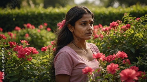 adult, air, beauty, bloom, bloom, character, colours, contemplative, daydreaming, elegance, enjoyment, environment, female, floral, flower, foliage, fresh, garden, gold, greenery, harmony, hours, landscape, light, love, natural, nature, outdoors, peaceful, personal, flower petals, pink, portrait, relaxation, ritual, rose, serenity, smiling, soft, summer, sunlight, thoughtful, calmness, vibrant, high-coloured, warm, woman, young