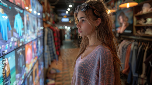 woman, standing, display, clothes, retail, store, browse, shopping, fashion, garment, apparel, selection, choice, decision, consumer, trendy, stylish, modern, shopping centre, shopaholic, consumerism, shopping centre, clothing store, client, fashion industry