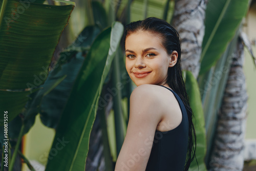 woman, standing, lush, greenery, palm tree, nature, tropical, outdoors, beauty, fashion, trendy, stylish, elegant, confident, attractive, young, beautiful, summer, exotic, paradise, vacation, leisure, relaxation, serene, peaceful, harmony, natural, growth, plant, leaf, environment, foliage, botanical, arboretum, scenery, sunlight, sunny, freshness