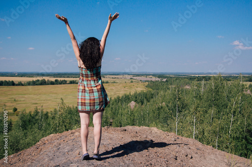 Woman standing with raised hands and enjoying the beautiful natu