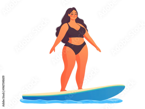 Woman surfing on a colorful board enjoying the ocean waves, cut out