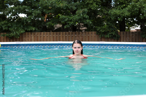 woman, swimming, pool, water, summer, swimming pool, bikini, swim, blue, fun, wet, relax, relaxing, relaxation, leisure, smile, sun