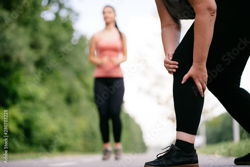 Woman touching her knee, sports injury at outdoor jogging. Health care, sports and medical concept