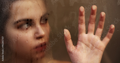 Woman touching steamy shower glass with hand