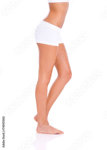 Woman, underwear and legs in studio or cosmetics with cellulite treatment, liposuction and glowing skin. Model, person and skincare with wellness, dermatology and cosmetology on white background