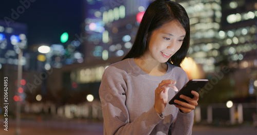 Woman use of cellphone in city at night