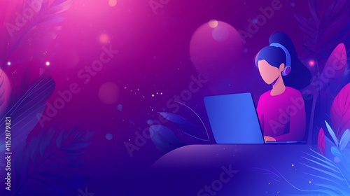 woman, laptop, earphones, purple, background, technology, digital, girl, computer, work, online, home, office, study, learning, music, audio, design, illustration, graphic, vector, modern, style, female, young, person, user, cyberspace, network, communication, connection, datum, information, screen, keyboard, desk, chair, leaf, plant, nature, abstract, vibrant, colourful, bokeh, light, glow, dark, night