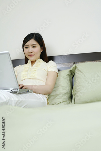 accessibility, adults only, asian ethnicity, bed, bedchamber, communication, computer, computing, connection, enjoyment, indoor, indoor, cyberspace, laptop, avocation, lifestyle, notebook, one person, pillow, relaxation, sitting, wi-fi, wireless technology, woman, young adult