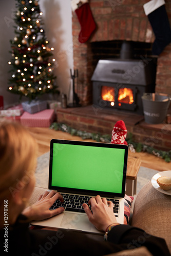 woman, computer, laptop, shopping, christmas, home, chroma key, copy space, retail, cyberspace, sale, indoor, lounge, living room, england, decoration, christmas tree, festive, holiday, closeup, point of view, typing, online, connected, communication, technology, vertical, man, male, one person, person, people, hand, buying, fire, stove, cosy, cosy, interior, snack