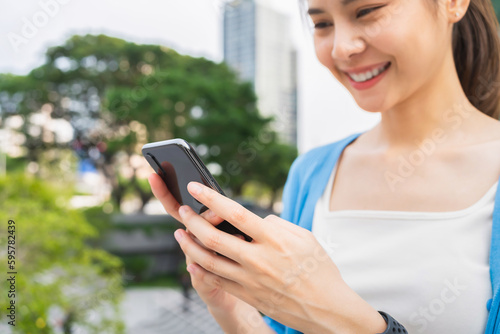 woman using smartphone in public areas, During leisure time. The concept of using the phone is essential in everyday life.