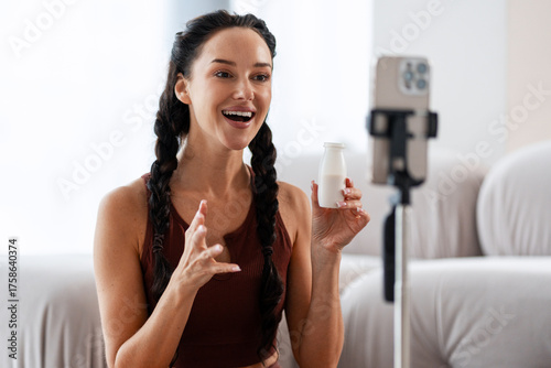 woman, video, healthy eating, fitness, lifestyle, cyberspace, web log, streaming, online, health, wellness, diet, dairy, food, yogurt, bottle, drink, healthy, active, young adult, missy, smiling, talking, explaining, sharing, communicating, technology, smartphone, mobile phone, tripod, recording, home, casual attire, authentic, real people, one person, brown hair, braid, activewear, indoor, modern, bright, positive, happy, engaged