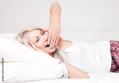 girl, woman, sleep, sleepy, arousing, get, female, young, adult, blond, bed, home, house, room, bedchamber, relax, rest, sexy, relaxation, comfortable, comfort, caucasian, casual attire, interior, indoor, alone, white, linen, cosy, health, smile, happy, happiness, cheerful, joy, joyful, positive, optimistic, harmony, lie, long, hair, pillow, pajama, stretch, up, morning, yawn