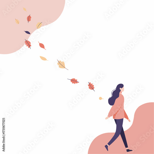 woman, walking, autumn, leaf, nature, breeze, casual attire, movement, female, solitary, relaxed, seasonal, colourful, coiffure, carefree, modern, illustration, graphic, pastel, leisure, calm, fall, street, beauty, peaceful, enjoyment, femininity, graphic design, scenery, style, animation, environment, character, vibrant, playful, joy, decoration, emotion, design, inspiration, artsy, creative, soft, lifestyle, unique, tranquil