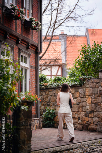 woman, walking, alley, laptop, sleeve, historic, backview, casual attire, quaint, charming, path, street, cobbled, architecture, solo, europa, flower, building, brick, stone, village, traditional, serene, peaceful, stylish, professional, freelance, modern, day, greenery, summer, relaxed, lifestyle, tech, fashion, town, travel, independence, natural, business, sidewalk