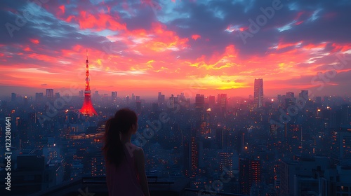 tokyo, sunrise, city landscape, woman, rooftop, sunset, japan, city, view, skyline, girl, travel, evening, dawn, building, urban, red, sky, cloud, beautiful, landscape, background, nature, architecture, light, amazing, scenery, panoramic, vibrant, colours, majestic, inspirational, hope, dream, peaceful, serene, calmness, silhouette, solitude, freedom, happiness, journey, adventure, discovery, exploration