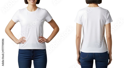 Woman wearing a white tshirt and blue jeans, front and back view, isolated on white background
